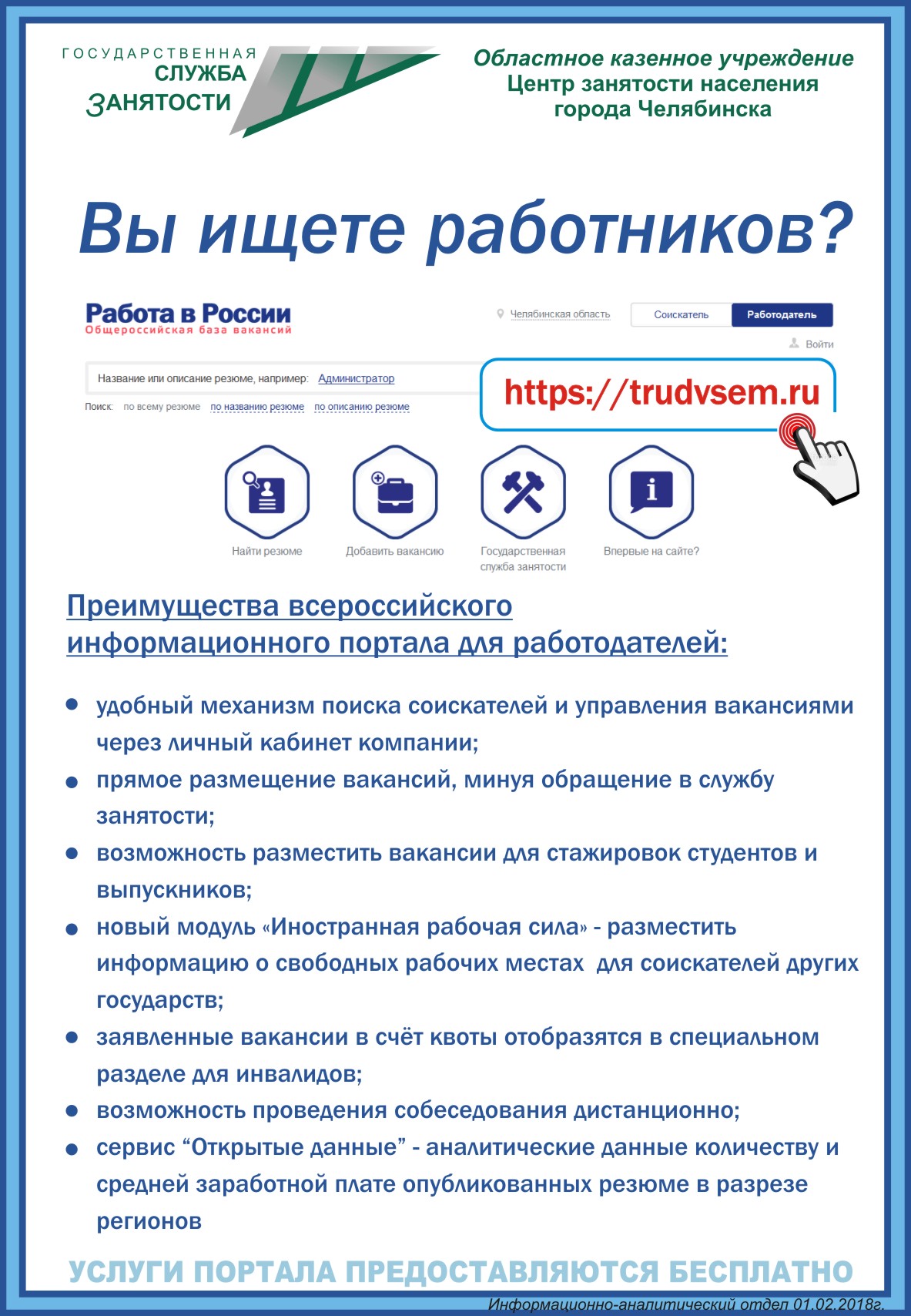 4. Количество вакансий, которыми располагает служба занятости, - 10531 ед. (на 31.12.2018 – 9516 ед.), по Челябинской области – 23926 ед.